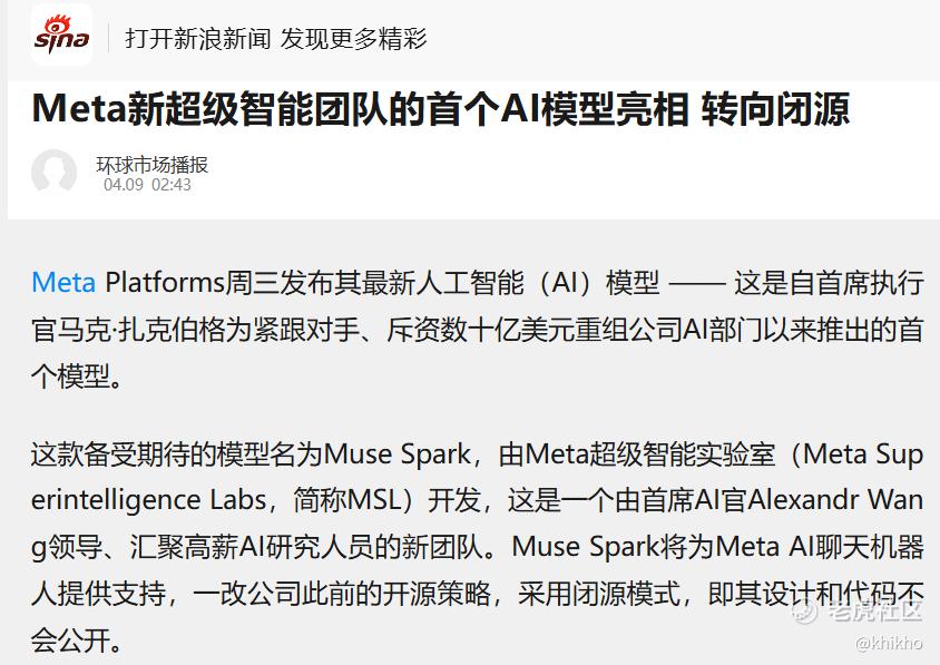2.国产架构引发的争议,消息提到 Muse Spark 借鉴了阿里等开源架构(如 Qwen 系列),这反映了目前全球 AI 开发的一种新常态,顶尖模型在技术架构上正高度趋同。但在目前地缘政治背景下,这确实会给 Meta 带来额外的合规与舆论压力。