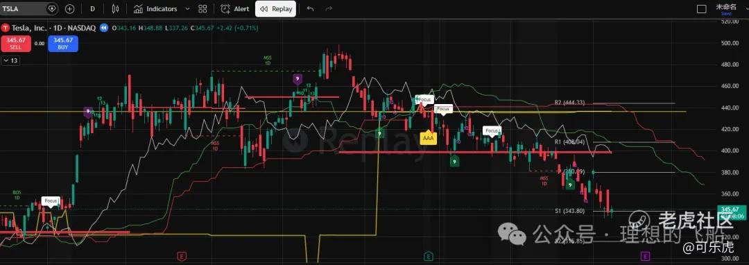 TSLA大跌前也出现几次控盘信号(白色标签)本次底部筑底不明显,如果这个位置或者315~320附近再出现控盘信号的话,会有大动作。届时我会提醒大家。