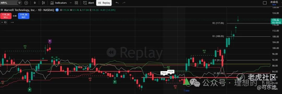 MRVL在2月23日监控到有“箱体突破”形态,走强介入价是85,在股价突破85之后还会有一波涨势