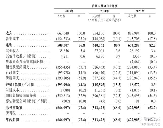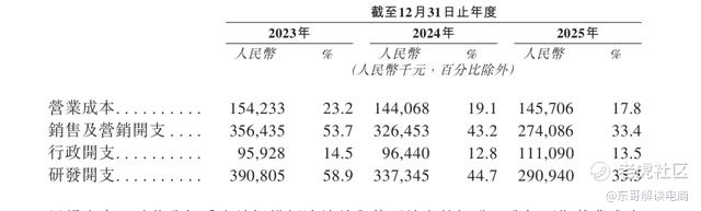 利润在很大程度上依赖于费用压缩,减少研发和营销的支出。招股书显示,研发支出从2023年的3.908亿元减少13.7%至2024年的3.37亿元,并进一步减少至2025年的2.909亿元,研发费用率从58.9%下滑至35.5%。与此同时,销售及营销开支也从2023年的3.56亿元降至2025年的2.74亿元,销售人员从615名裁减至484名。