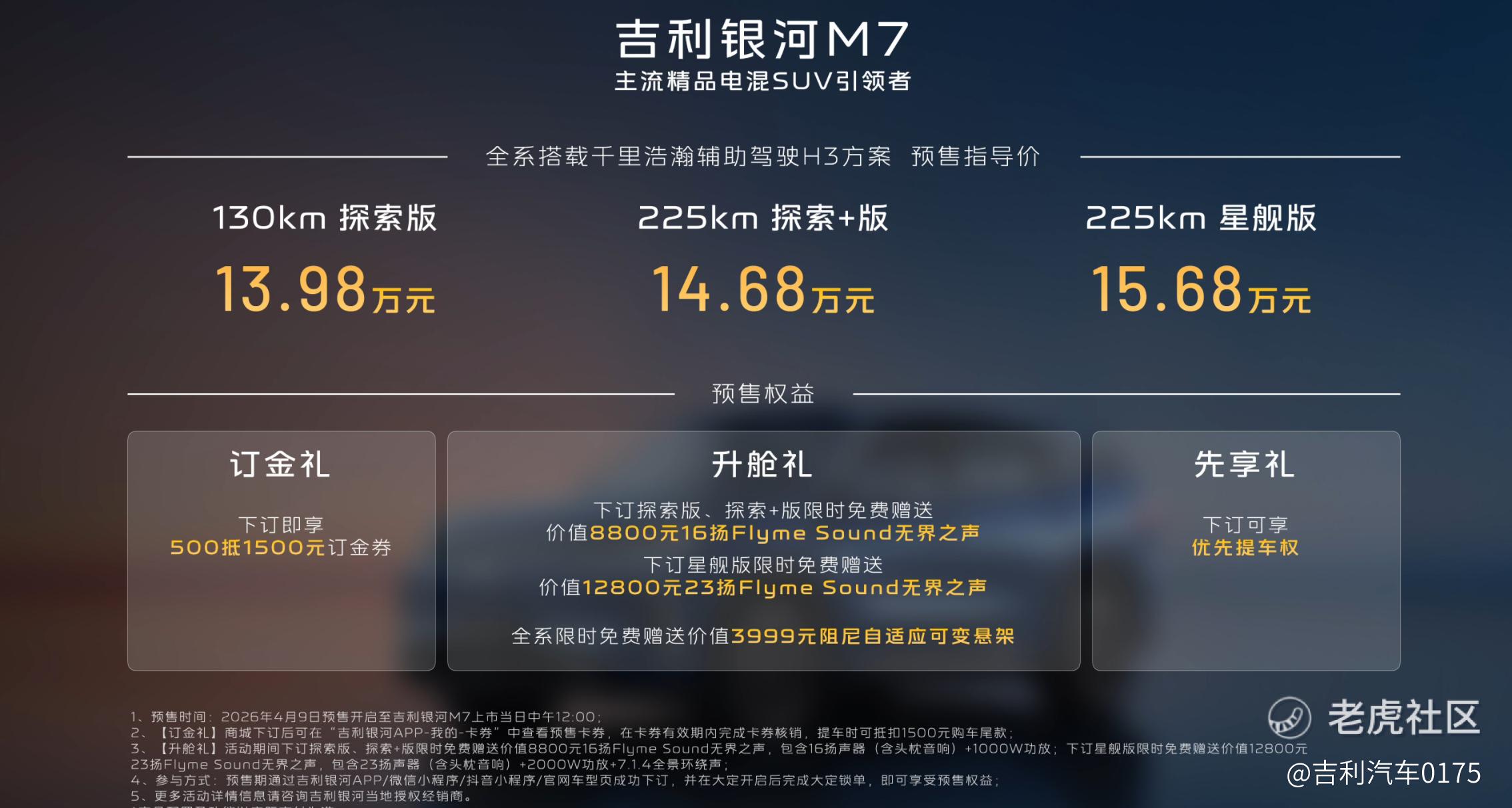 4月9日,“主流精品电混SUV引领者”吉利银河M7正式开启全球预售。预售价13.98万元-15.68万元。