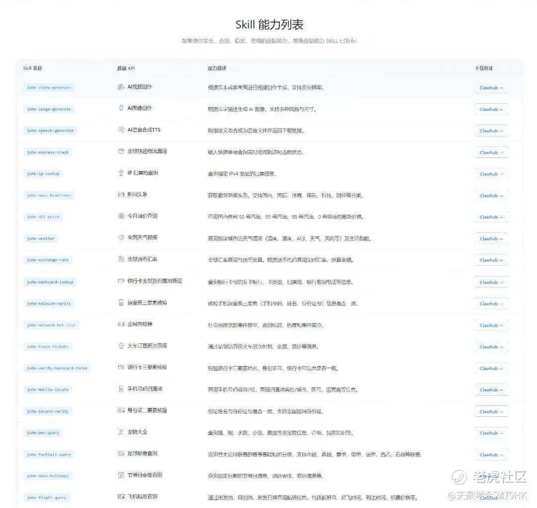 目前,基于聚合数据平台安全、合规、稳定、准确的数据能力,首批数据能力 SKILL 已经发布,覆盖内容生成、生活服务、金融核验、出行旅游、信息查询等多个领域: