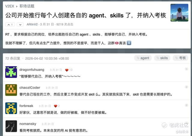 一开始以为是在玩梗,结果有技术社区V2EX爆料,现实中真的有公司开始推行每个人创建各自的agent、skills,还将其纳入日常考核。