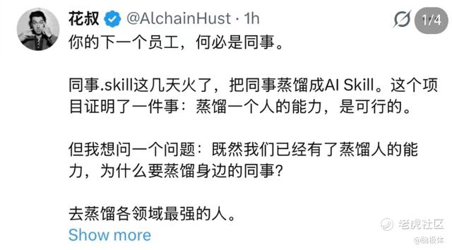 至此,职场中可蒸馏的对象,可以说是无所不包了。从自家公司的基层员工到管理层,到外部的名人、专家,甚至竞争对手。所有人都能被蒸馏成skill,以后的职场只需要一个个skill,互相安排工作、对接协作?