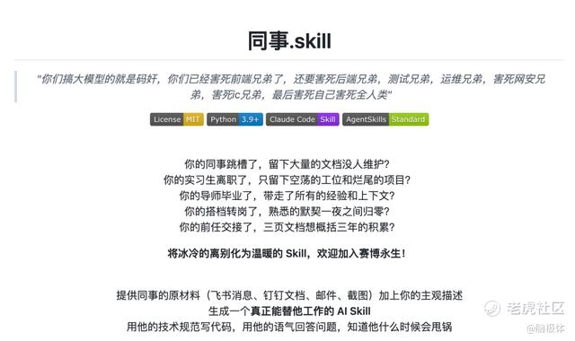原来,这个本该彻底从公司消失的人,已经被名为“同事.skill”的项目炼化了,他的飞书消息、邮件、工作文档,甚至处理工作的思维模式和方法论,都被喂给AI,变成一个md文件,继续为公司打工。