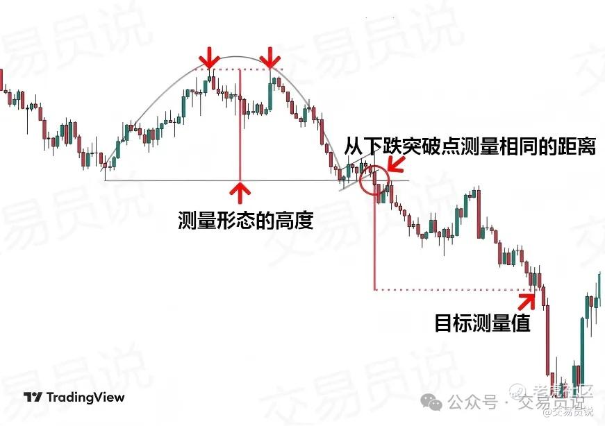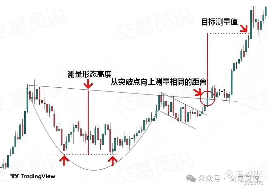 设定量度目标:杯柄形态也有一个“量度目标”。它等于从颈线突破位置开始计算的整个形态高度。