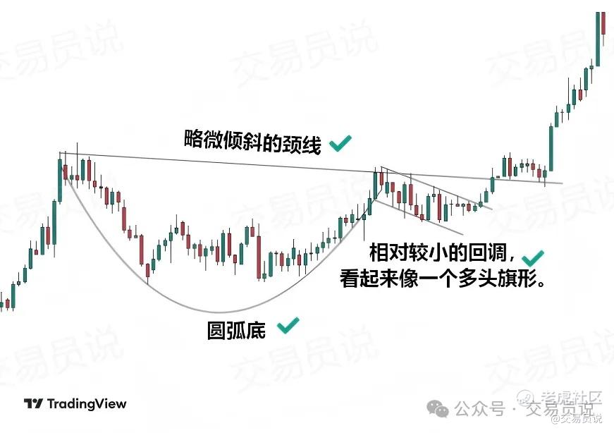 有效颈线、圆弧底以及多头旗形“柄”的杯柄形态示例。