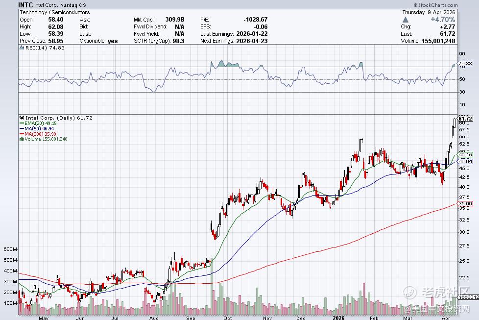 本周四,英特尔大涨4.7%,录得七连阳,创下自2023年9月以来最长连涨纪录。4月累计涨幅已接近40%,年内涨幅扩大至67.26%,过去12个月更是累积飙升186.67%,站上近五年新高。