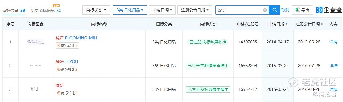 企查查App显示,绽妍母公司绽妍生物科技股份有限公司(以下简称“绽妍生物”,证券代码:874888)成立于2019年12月,是新三板挂牌企业,同时拥有高新技术企业、专精特新中小企业等资质。而在第3类日化用品商标方面,绽妍名下较早的3个商标均为受让所得,并非自主注册。