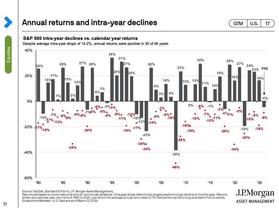 仔细来看,标普 500 指数平均每年年内下跌 14%。