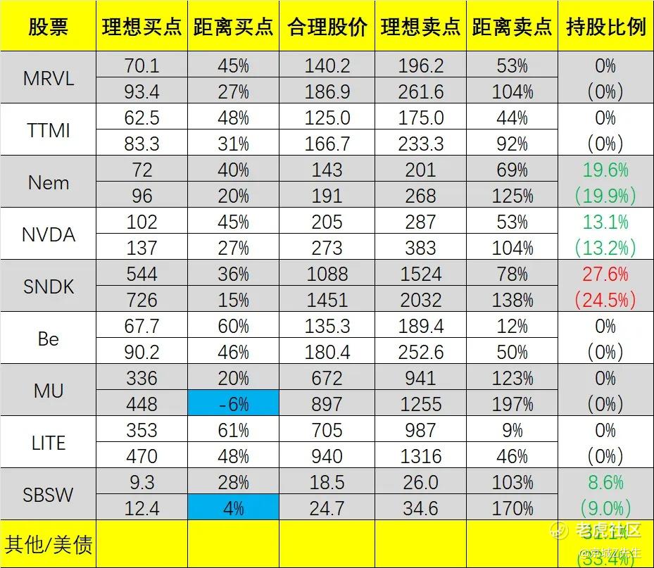 NVDA 13.1%,SNDK 27.6%,NEM 19.6%,SBSW 8.6%,现金/美债 31.1%。