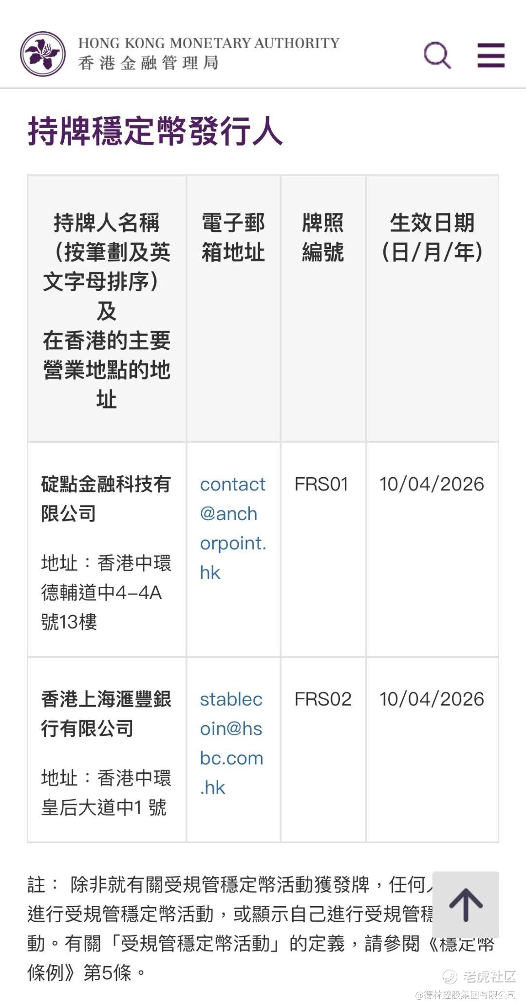 2026年4月10日,香港金融管理局依据《稳定币条例》,向碇点金融科技(渣打银行、香港电讯、安拟集团(Animoca Brands)合资组建)与汇丰银行颁发首批稳定币发行人牌照,牌照当日生效。
