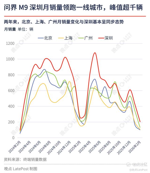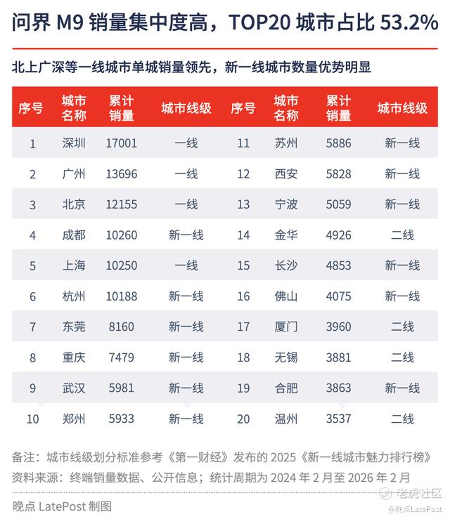 问界 M9 在高端消费市场的渗透程度令人瞩目。两年来,销量排名前二十城市的合计销量占比达 53.2%,这样的高集中度体现出问界 M9 在核心消费群体中的受欢迎程度。其中,深圳以 1.7 万辆的累计销量领跑全国,广州、北京等一线城市紧随其后;成都、杭州等新一线城市同样表现出强劲的购买力,单城累计销量过万。