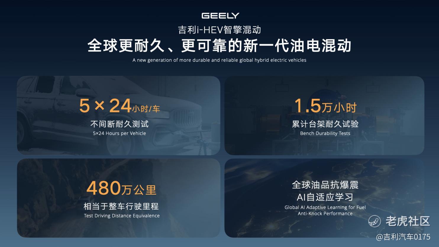 多年来,吉利始终以严苛标准坚守产品可靠性,为全球用户打造更耐久、更可靠的高价值产品,这一理念也同样贯穿i-HEV智擎混动技术的开发全过程。依托全球最极限验证体系,吉利对i-HEV智擎混动累计开展了1.5万小时的台架耐久试验,相当于整车行驶里程约480万公里,比传统混动标准高出20%以上;还通过AI自学习方式,让发动机自适应全球不同油品的抗爆性指标,确保i-HEV智擎混动产品在全球任一地区都能安全高效行驶。