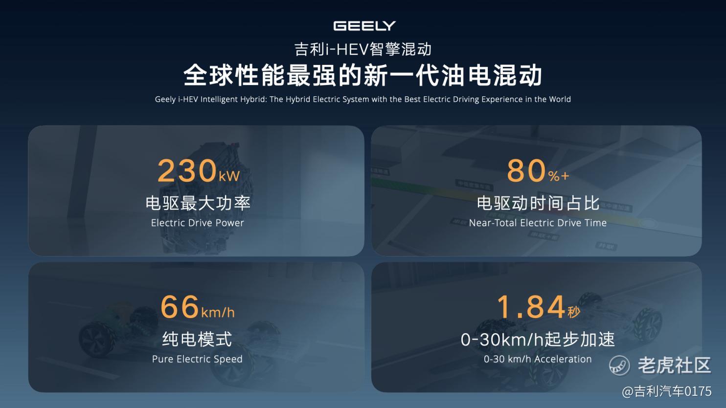 为提升动力性能与电感体验,i-HEV智擎混动还搭载11合1混动电驱,最大功率可达230kW,是日系混动的1.72倍。更大的电驱加持,让i-HEV智擎混动车型在WLTC工况下拥有80%以上电感体验,发动机工作时长比传统混动少27%以上;并可在66km/h实现纯电模式行驶,比传统混动高了20%以上;0-30km/h起步加速仅1.84秒,比日系混动快18%,动力响应时间仅10毫秒,起步无迟滞,行驶无顿挫,带来电车一般的驾乘感受。不仅如此,通过智能停机位置预测技术,电驱可瞬时拖动发动机至最佳点火转速,使启动振动降低32.7%,并基于吉利自研的EOC发动机阶次噪声主动控制技术,噪音仅比纯电高1分贝,带来电感更强、加速更快、NVH更静谧、驾乘更平顺的全新体验。
