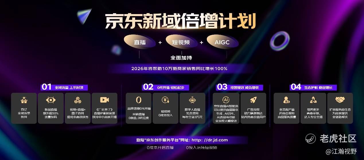 为进一步降低商家入局直播和短视频的门槛、提升流量转化和经营效率,京东在2026年围绕流量扶持、降本增收、智能提效、生态护航四大维度,推出12项关键举措,全方位助力商家实现确定性增长。