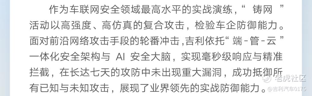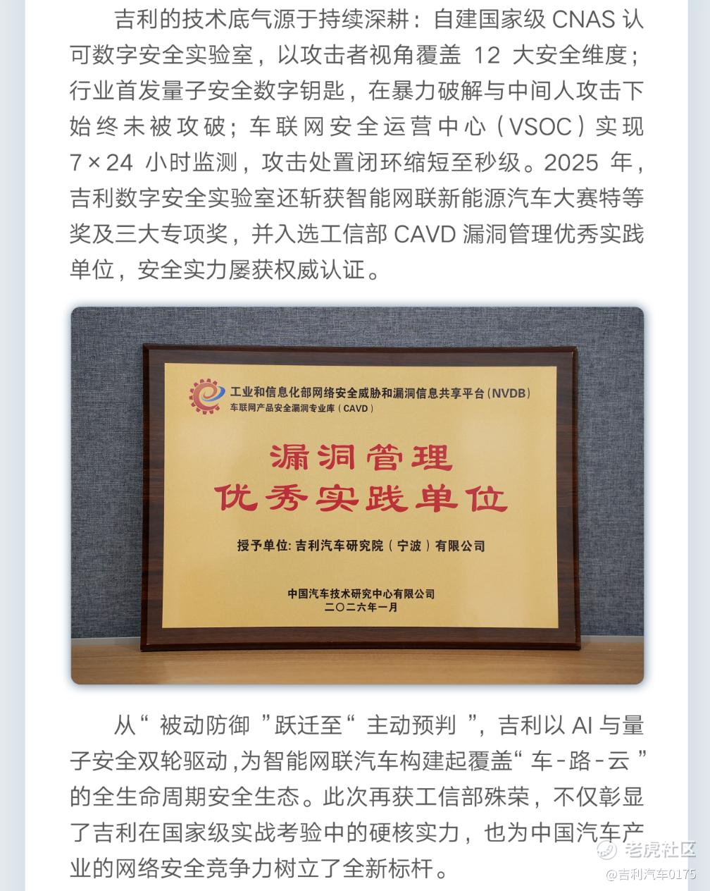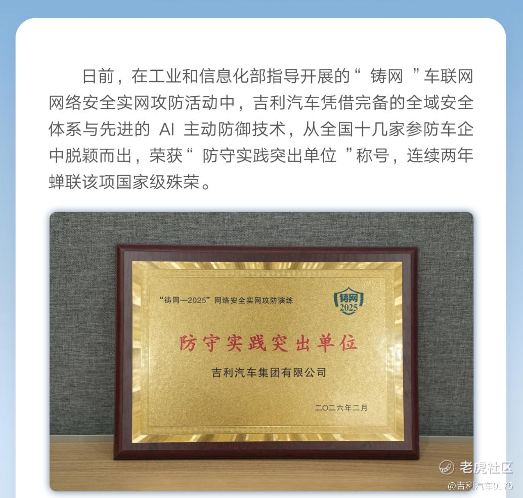 日前,在工业和信息化部指导开展的“铸网”车联网网络安全实网攻防活动中,吉利汽车凭借完备的全域安全体系与先进的AI主动防御技术,从全国十几家参防车企中脱颖而出,荣获“防守实践突出单位”称号,连续两年蝉联该项国家级殊荣。