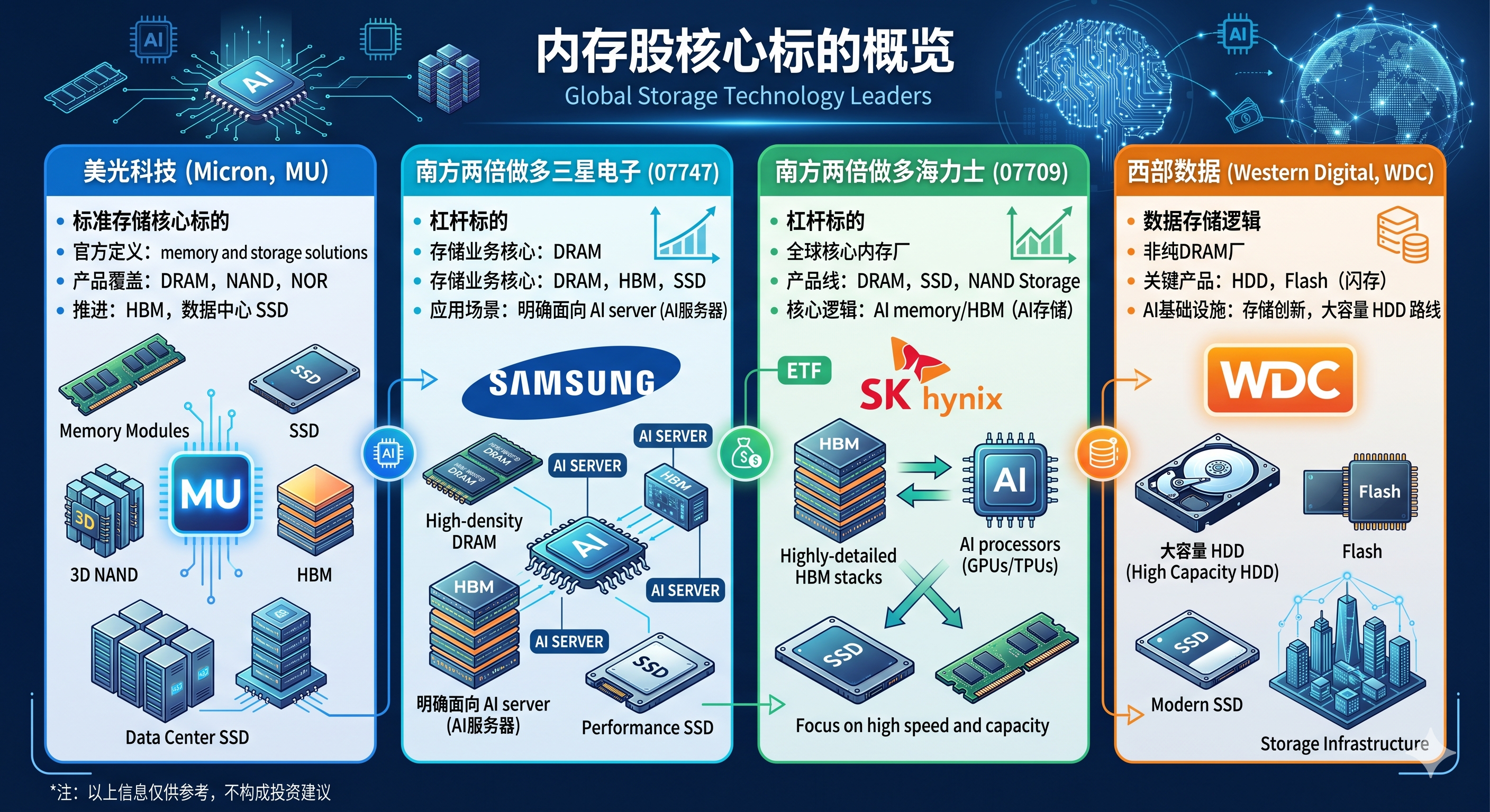 $南方两倍做多海力士(07709)$ (SK海力士):也是全球最核心的内存厂之一,官网产品线包括 DRAM、SSD、NAND Storage,近年最强逻辑之一就是 AI memory/HBM。