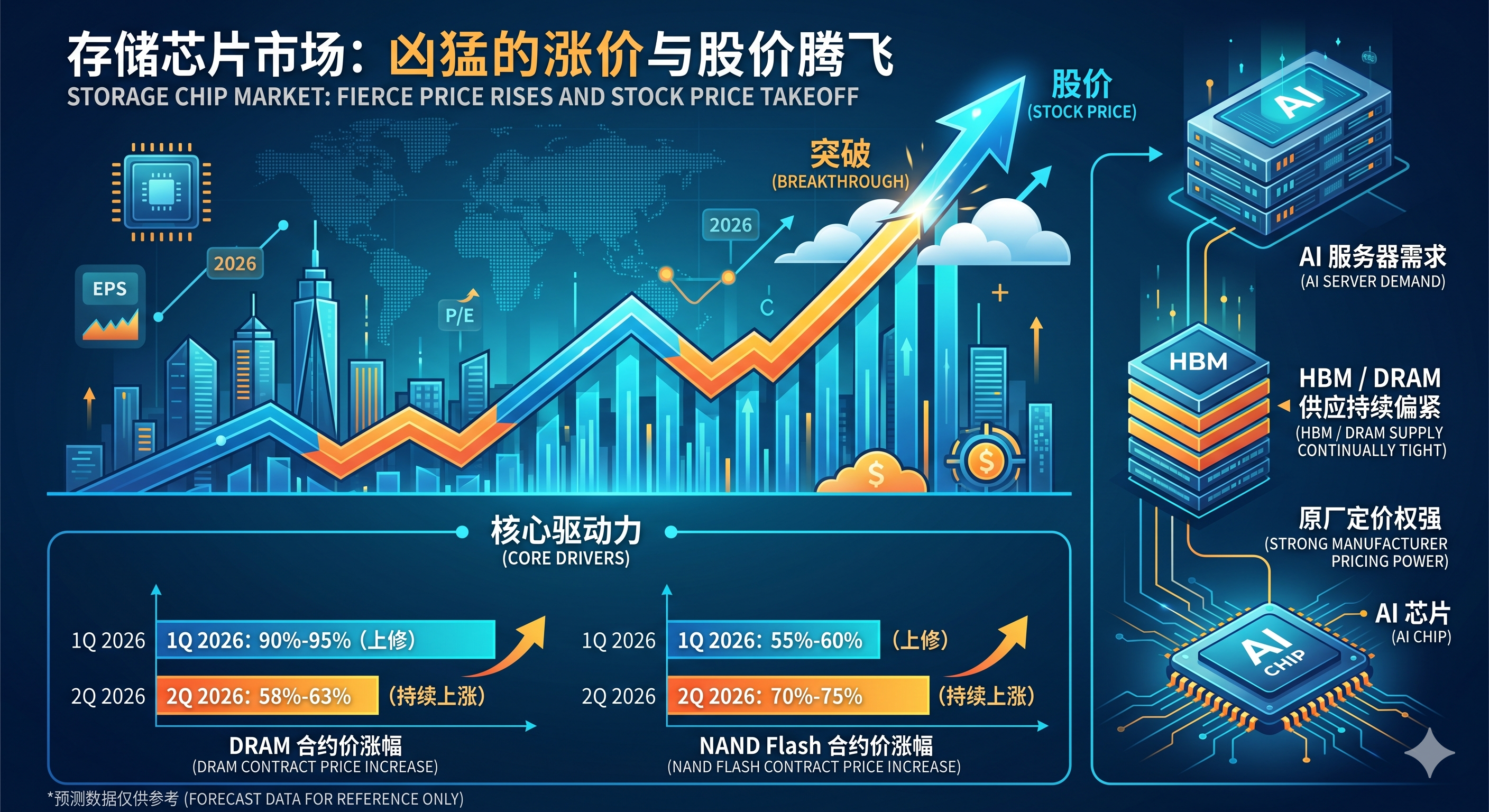 存储芯片现在正在经历一轮非常凶的涨价。2026 年第一季度,常规 DRAM 合约价涨幅从原本预估的 55%—60%,直接上修到 90%—95%;NAND Flash 合约价涨幅也从 33%—38%,上调到 55%—60%。到了第二季度,涨价还没停,DRAM 预计继续涨 58%—63%,NAND Flash 预计再涨 70%—75%。而在 AI 服务器需求拉动下,DRAM、HBM 供应持续偏紧,原厂的定价权依旧很强。