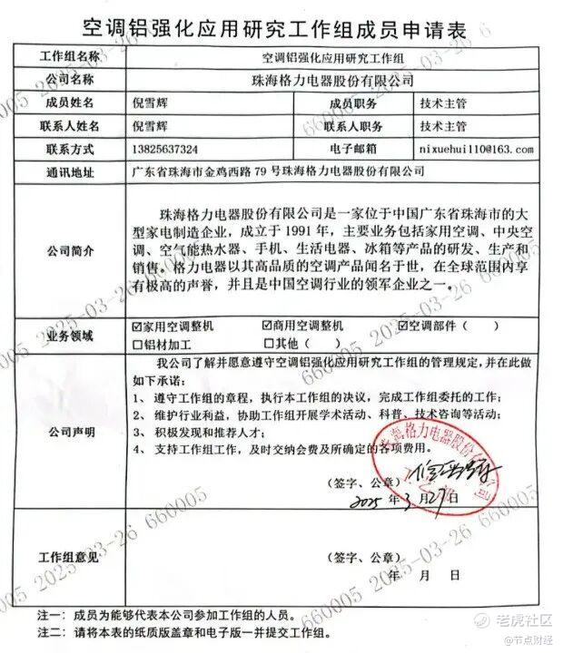 更具杀伤力的是,杨祥玺随即贴出一张《空调铝强化应用研究工作组成员申请表》,而该表格上的签字企业赫然正是格力。言外之意再明显不过——一边高举“真铜实料”的旗帜大声疾呼,一边却曾报名参与“铝强化应用研究”,这番操作究竟该如何解读?