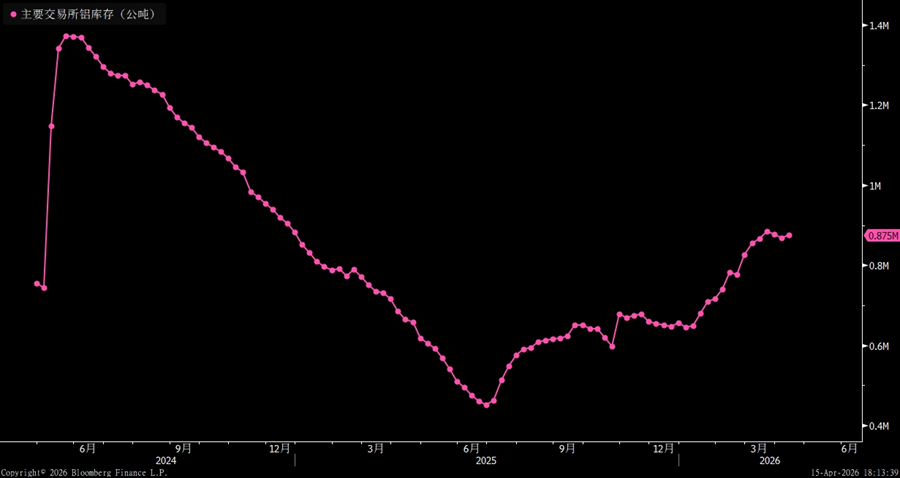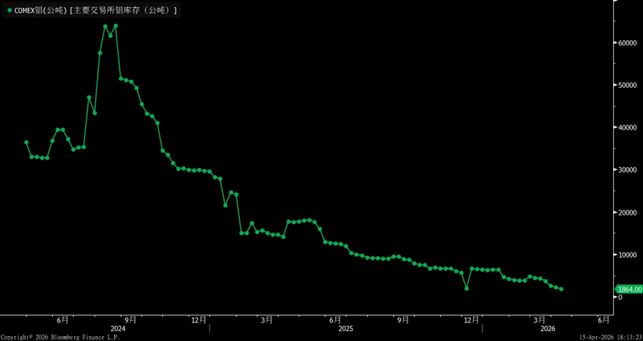 截至2026年4月10日,三大主要交易所铝库存合计约0.875M(87.5万吨)。其中,COMEX铝库存约 1864 吨,LME 铝库存约0.399M(39.9万吨),上海铝库存约0.474M(47.4万吨)。