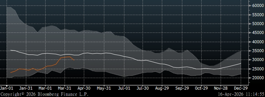 库欣地区原油库存: 在美国原油主要交割地库欣地区,2026年的库存曲线(橙线)走势同样表现上行趋势。但与全美库存不同的是,库欣地区最新的绝对水位已跌至30,000以下,明显低于2021-2025年的历史均值(白线),处于五年历史区间的偏低分位点。