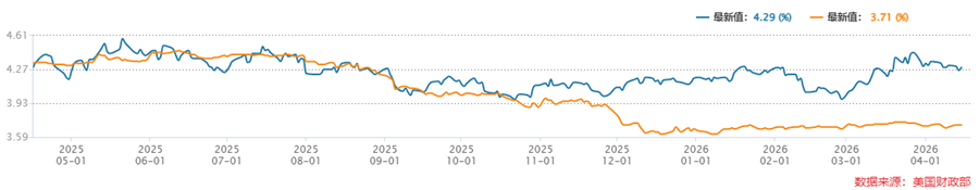 在收益率曲线上,根据wind最新数据,截至2026年4月15日,美国10年期国债收益率录得4.29%,3个月期国债收益率录得3.71%。观察图表最右侧的近期走势形态,在最近一周的观测窗口内,3个月期短端收益率(黄线)近期略有上升;而10年期长端收益率(蓝线)在小幅的回落与震荡中与上周持平。两者之间的正向利差略有缩小。
