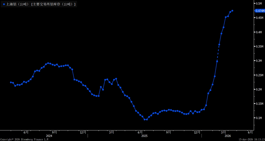 从最新一周的边际变化看,三大交易所铝库存仍延续明显分化。COMEX铝库存继续下行,最新读数降至1864吨,说明美国市场铝库存仍处在低位去化状态。LME铝库存也继续回落至约0.399M,延续了此前较长时间的下行趋势,海外现货偏紧格局没有明显缓解。上海铝库存则小幅上升至0.474M,仍处于年内高位区间,显示国内库存压力仍在累积。