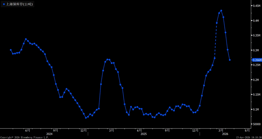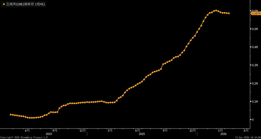 从绝对水平与历史分位来看,截至2026年4月10日,全球铜显性库存总计约1.327M(约132.7万吨),仍处于近年来偏高位置。其中,CME铜库存约0.587M短吨,LME铜库存约0.393M,上海铜库存约0.266M。拉长周期来看,过去一年全球铜库存整体维持在高位区间,尤其是海外库存此前持续抬升,使得总库存长期承压,绝对库存压力尚未明显缓解。