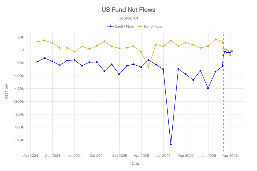 美股资金仍为净流出:截至2026年4月8日当周,美国股票型基金单周净流出36.6亿美元,继续保持净流出,说明权益类共同基金整体仍处于资金撤出阶段,显示资金情绪并未实质性反转。