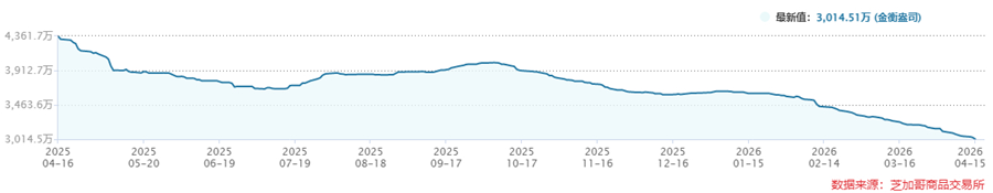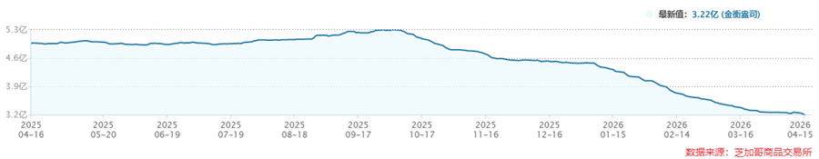 库存端(实物基本面):截至2026年4月15日最新数据,COMEX黄金库存最新值录得3,014.51万金衡盎司,白银库存最新值录得3.22亿金衡盎司。从历史走势来看,两者均呈现出极其陡峭的长期下行趋势。尤其是进入2025年下半年至2026年以来,金银库存的去化斜率显著加速。目前两者的绝对库存量均已跌破2021-2025年的所有低点,处于近年来的历史最低水位区间。