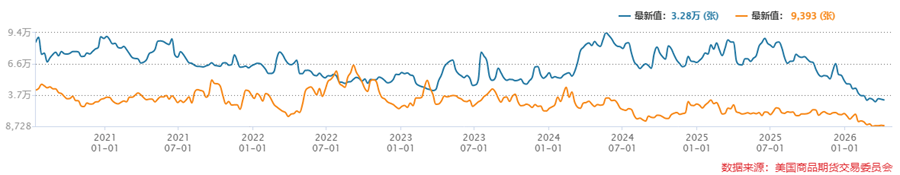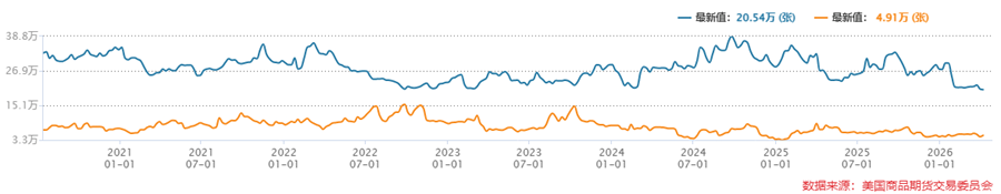 在资金端,黄金与白银的非商业多头持仓(蓝线)在图表最末端均呈现出下降的趋势,空头持仓则出现分化,黄金的非商业空头有所增加,白银的非商业空头则在下降。这意味着黄金市场的看空或对冲力量边际增强,而白银市场的空头压力则有所缓解,显示两者在资金情绪上的方向并不完全一致。