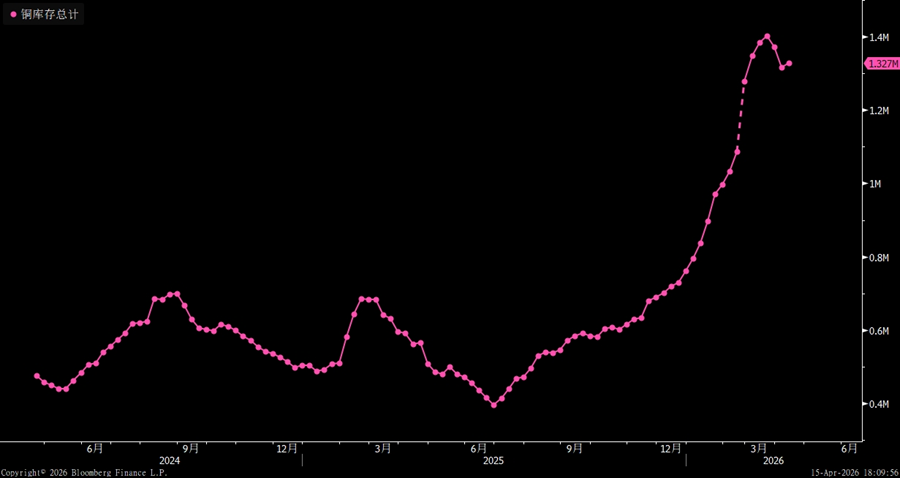 观察图表最右侧的边际形态可以发现,最新一周所反映出的并不是同步累库或同步去库,而是较为清晰的分化:上海铜库存继续明显下降,CME铜库存略有减少,LME铜库存则继续增加。由于LME的增量大于上海和CME的减量,全球铜库存总计在上一周下降之后,本周重新转为上升。也就是说,最新一周的核心特征是“上海去库、CME小幅回落、LME继续累库、总库存再度上行”,当前库存边际压力仍然主要来自海外市场。