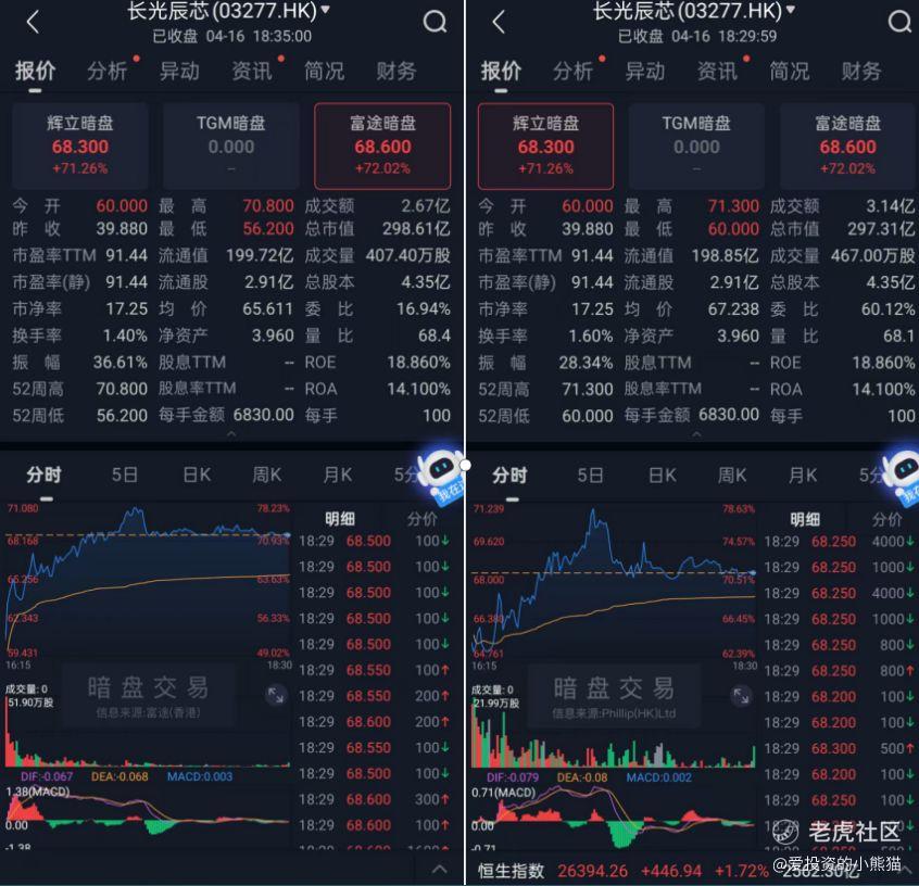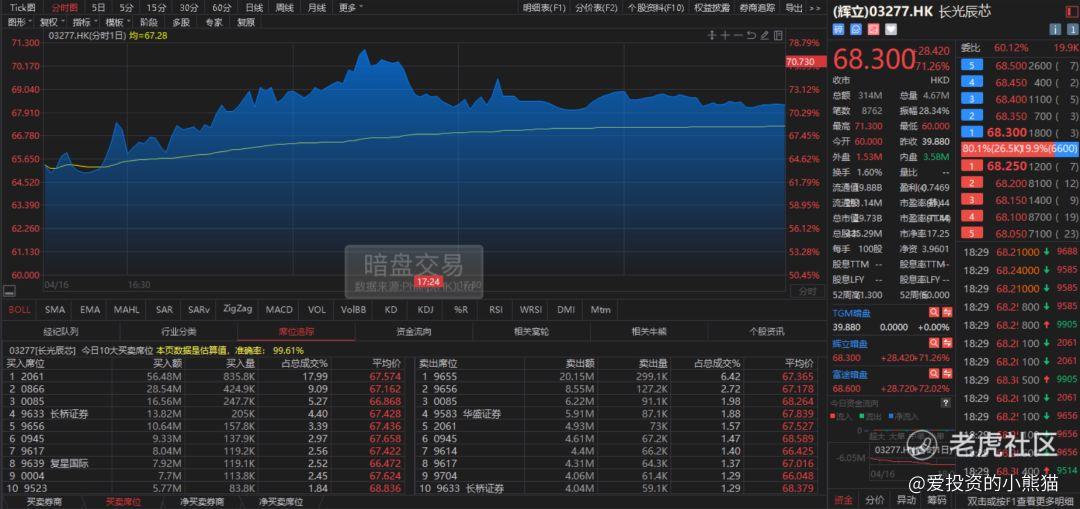 长光辰芯(03277.HK) 辉立暗盘以最低点60.00港元高开,一直上冲到最高点71.30港元后回落,再震荡整理,尾盘以68.30港元报收,涨幅为71.26%,振幅28.34%,成交3.14亿港元。
