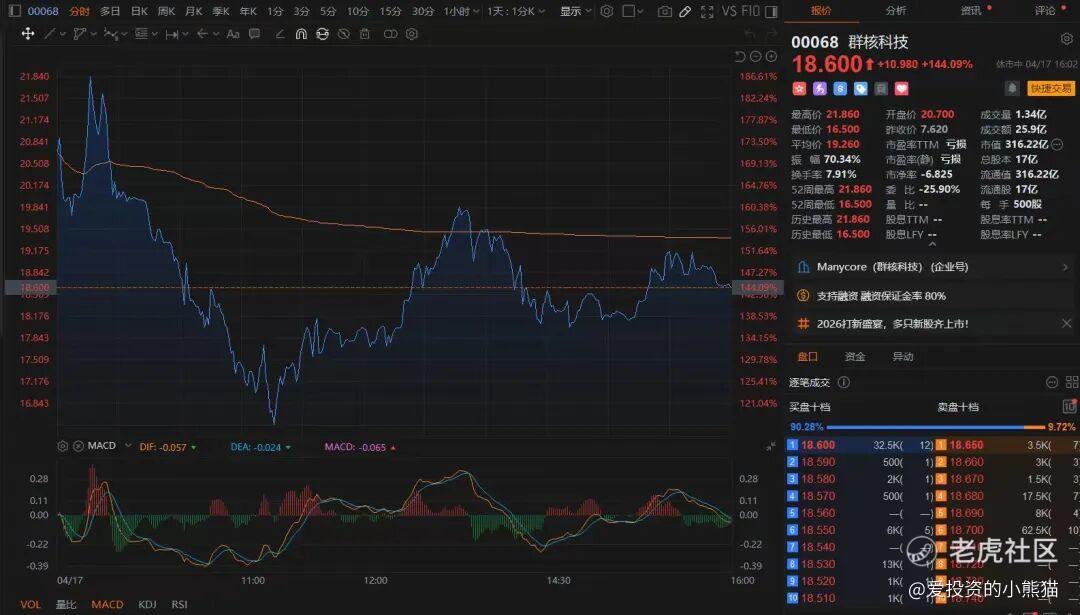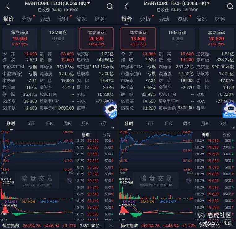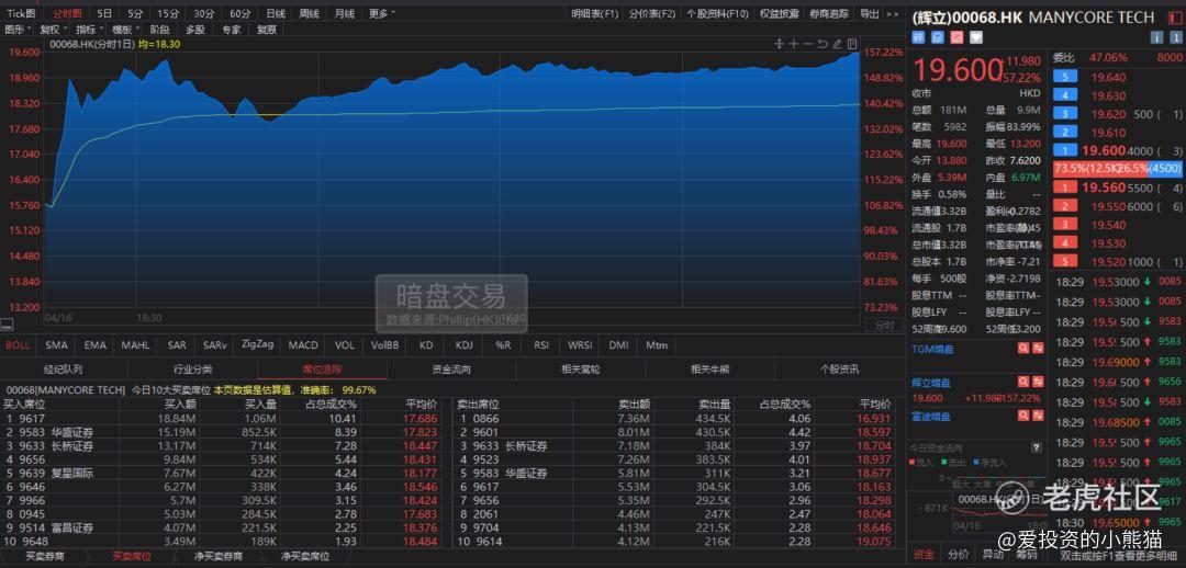 MANYCORE TECH(00068.HK)辉立暗盘以13.88港元高开,立马下探到最低点13.20港元企稳上冲,最高摸到19.60港元,再震荡整理,尾盘又收到19.60港元,涨幅为157.22%,振幅83.99%,成交1.81亿港元。