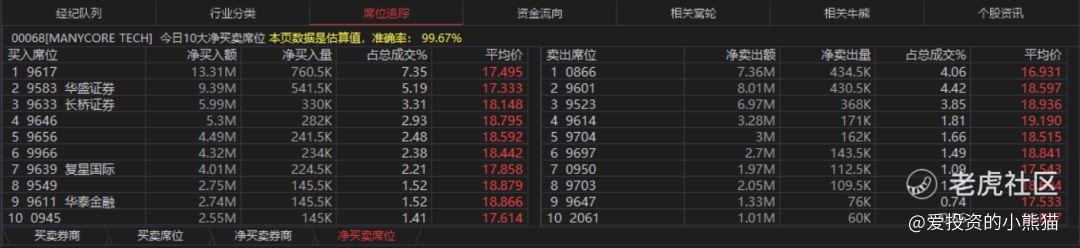 MANYCORE TECH(00068.HK)买盘席位有9617、9583、9633、0945等,卖盘第一席位是0866,0950在卖盘第七席位。