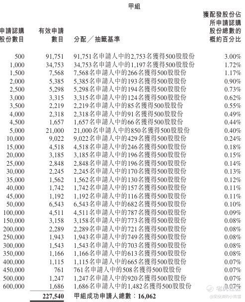 配售情况:266501人认购,这次公配1138.21倍,由于机制B分配,无回拨比率,国配有22.69倍,一手中签率1.00%,认购2000手稳中1手,同时乙组12868人申购,其中顶头槌申购245张,获配率0.03%-0.10%。