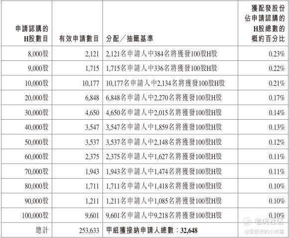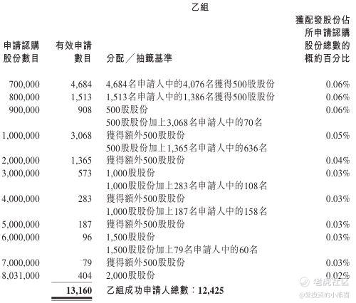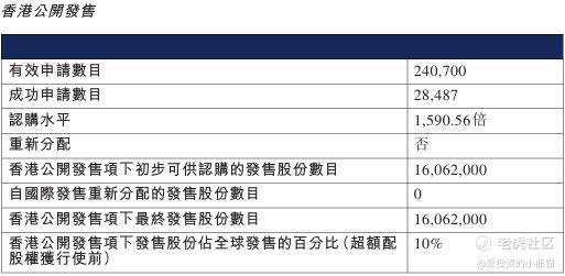 配售情况:240700人认购,这次公配1590.56倍,由于机制B分配,无回拨比率,国配有14.46倍,一手中签率3.00%,认购1800手稳中1手,同时乙组13160人申购,其中顶头槌申购404张,获配率0.02%-0.06%。