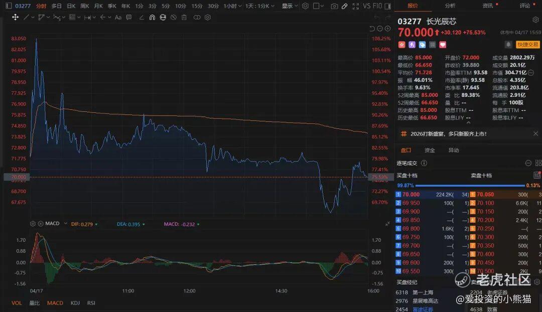 长光辰芯以发行价39.88港元为基准,开盘报72.00港元,涨幅80.54%,开盘后股价并未止步,而是延续震荡上行态势,盘中一度冲高至85.00港元,最大涨幅超过113%,随后在高位有所回落,最终收盘报70.00港元,全日涨幅达到75.53%,全天交投活跃,成交近2802万股,总成交额超20亿港元,市场关注度与资金承接力均表现突出。