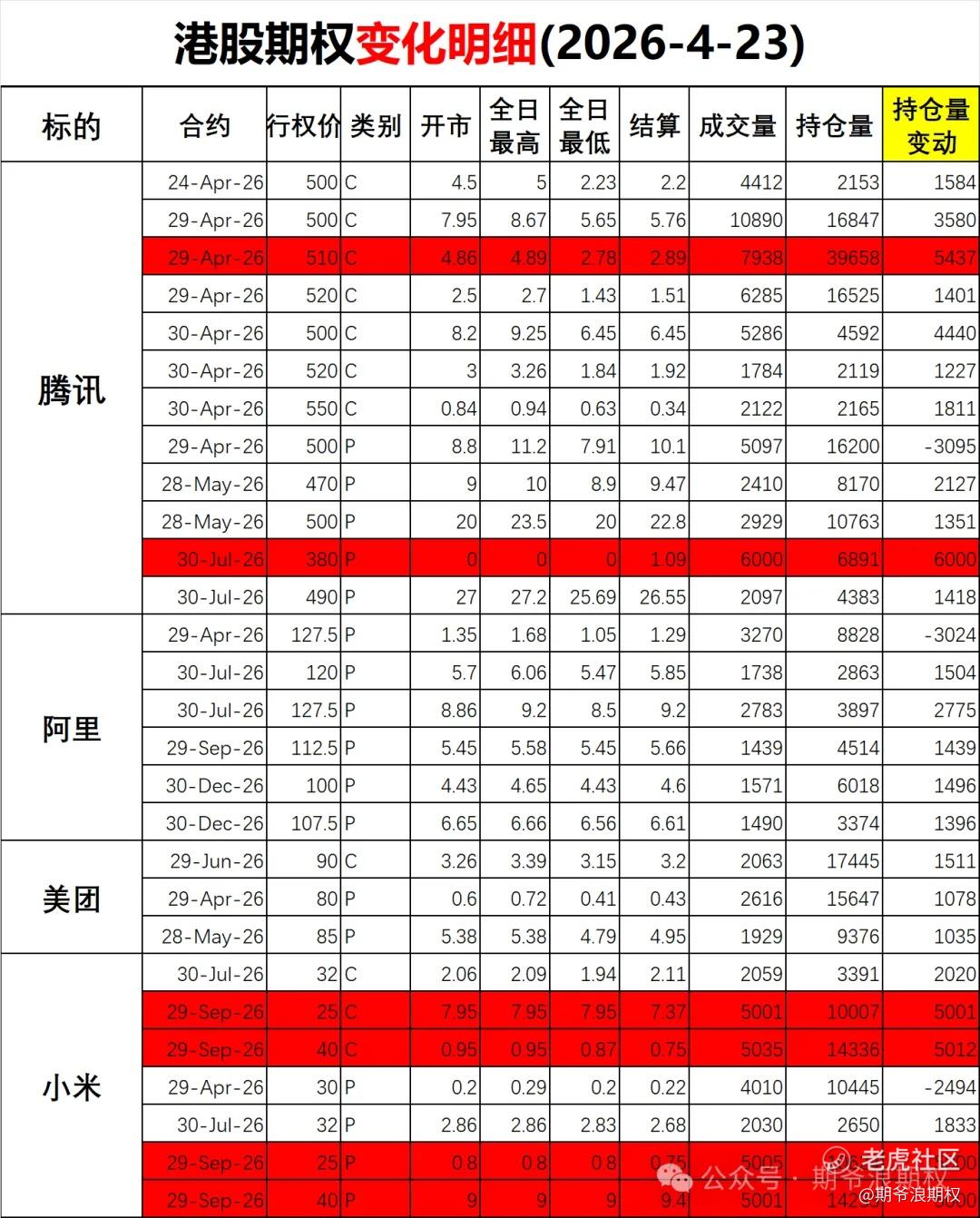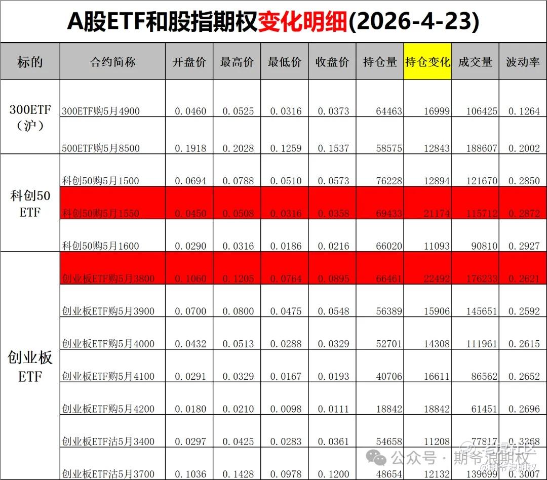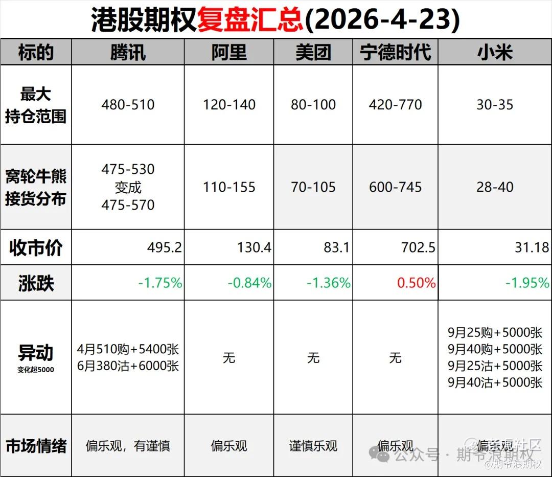 不管行情怎么走,期权复盘瞅一瞅。下面是A股和港股的期权复盘汇总和变化明细,期权变化明细要注意的是: 红色表示增仓较大 绿色表示增仓较大 粉色表示深度实值增仓(看多) 浅绿色表示深度实值减仓(看空)