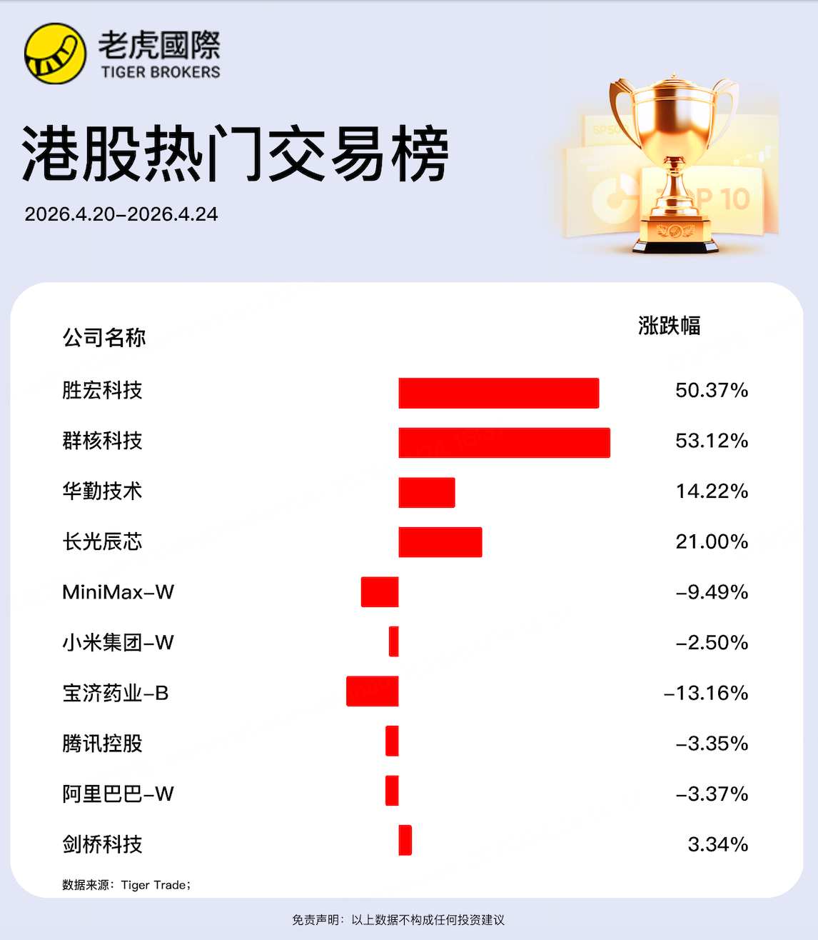 港股新股市场本周延续高热度,尤其集中在硬科技和新经济方向。4月21日,PCB龙头胜宏科技登陆港交所,香港公开发售获431.15倍认购,上市首日收涨50.09%,募资净额约198.89亿港元,成为今年以来港股最大规模IPO。此前群核科技上市首日上涨144.09%,思格新能上市首日上涨103.42%。新股赚钱效应强化后,港股市场的风险偏好并未完全降温,资金仍愿意给AI、硬科技和A+H上市公司较高关注度。