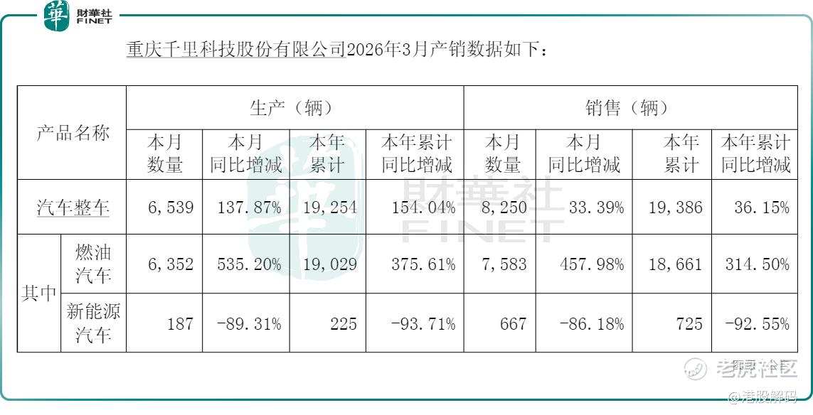 值得一提的是,A股披露的3月产销数据显示,千里科技年内的燃油汽车产销量在大幅增长,而新能源汽车产销量均遭遇暴降,据称系“产线调整”所致,何时能恢复需关注。