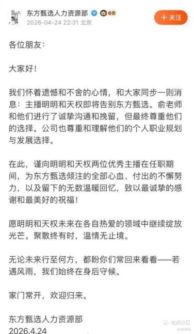 ③反思管理:他公开致歉,并承认在管理层调整后,公司管理方式出现偏差,过度侧重制度管控而忽视人文关怀,导致团队氛围出现问题。他承诺后续东方甄选将优化管理模式,平衡制度化运营与人文关怀,整改僵化、高压的管理问题。