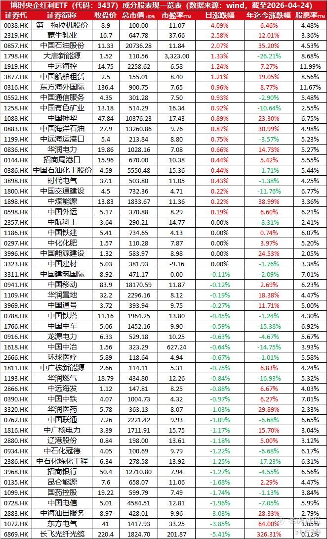 $博时央企红利(03437)$ 今年以来,国新港股通央企红利指数涨幅达+12.40%;本基金TTM股息率为6.51%