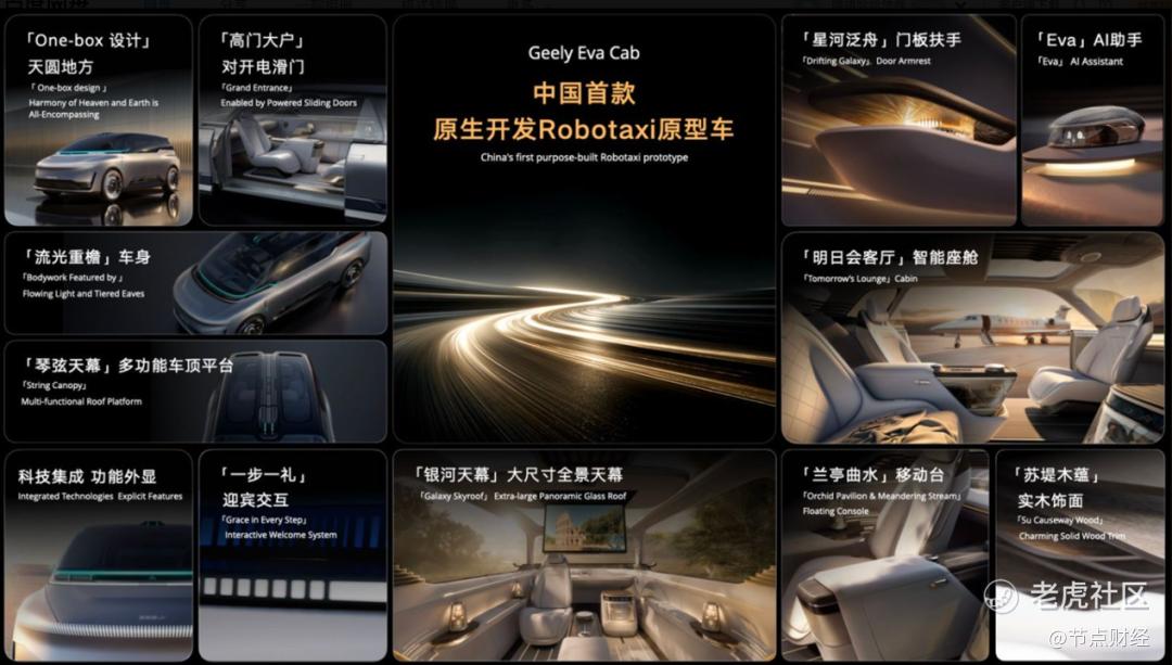 不同于其他L4级产品,吉利推出的Eva Cab让人能够感受到更多科技背后的人文浪漫,这款原型车不止有强悍的参数,其驾舱设计充满对乘坐者的温暖关怀。比如“天圆地方”的设计理念、门板扶手处的“星河泛舟”巧思,“一步一礼”的迎宾交互……无不体现出中国传统文化之美,用工业设计、硬核科技,打造出了一款具有文化自信的“出行机器人”。