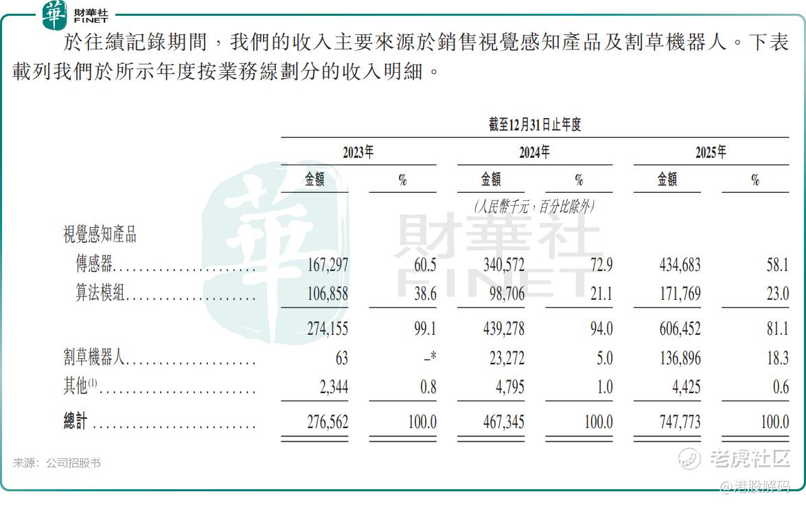 随着业务快速发展,乐动机器人收入持续攀升,2023年为2.77亿元(单位人民币,下同),2024年增长至4.67亿元,2025年进一步提升至7.48亿元,三年复合年增长率约为64.4%。从收入构成来看,2025年视觉感知产品收入占比为81.1%,而割草机器人收入占比已快速上升至18.3%。
