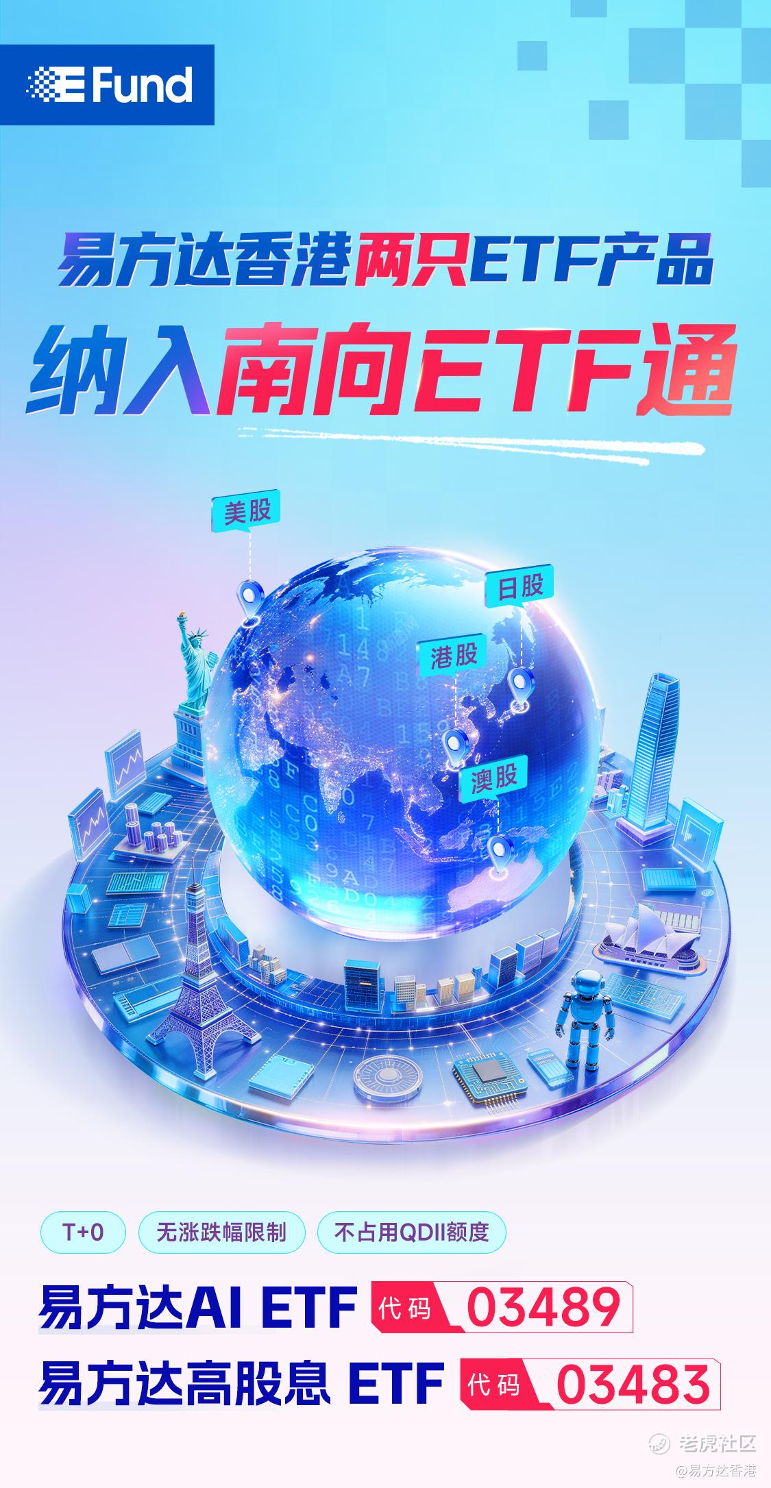 4月24日,沪深交易所正式公布“南向ETF通”扩容名单。易方达资产管理(香港)有限公司旗下易方达高股息ETF(03483) $易方达高股息(03483)$ 与易方达AI ETF(03489) $易方达人工智能ETF(03489)$ 纳入港股通ETF标的名单,并将于2026年5月6日起生效。作为易方达香港重磅打造的“60/40系列”标杆产品,这两只ETF可一键布局港股核心并辐射全球优质资产,为内地投资者提供全球资产配置的便捷新选择,进一步丰富了跨境资产配置生态圈。
