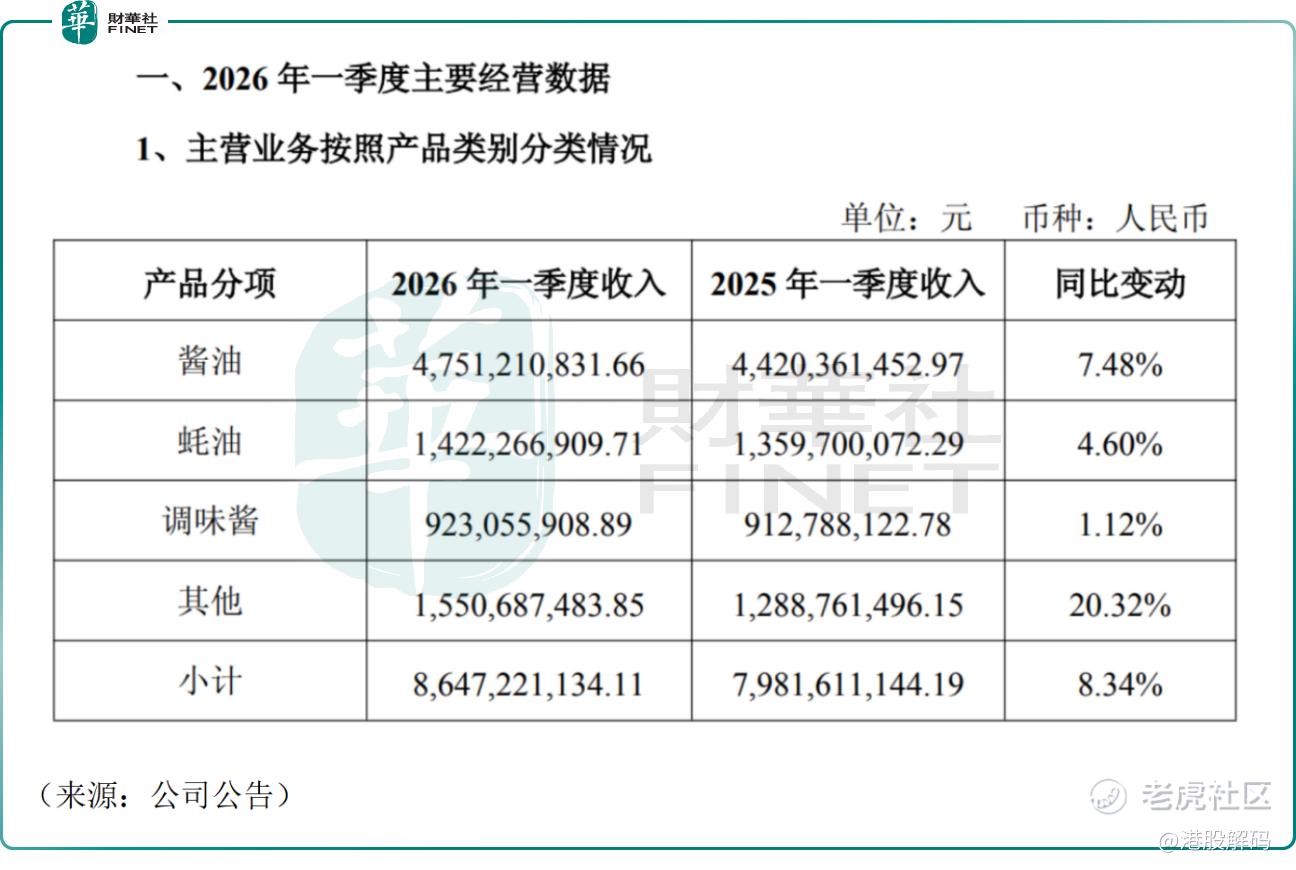根据海天味业A股的最新公告,2026年第一季度公司实现营收90.29亿元(人民币,下同),同比增长8.57%;实现归母净利润24.44亿元,同比增长10.97%;实现扣非净利润23.47亿元,同比增长9.34%,业绩符合市场预期。