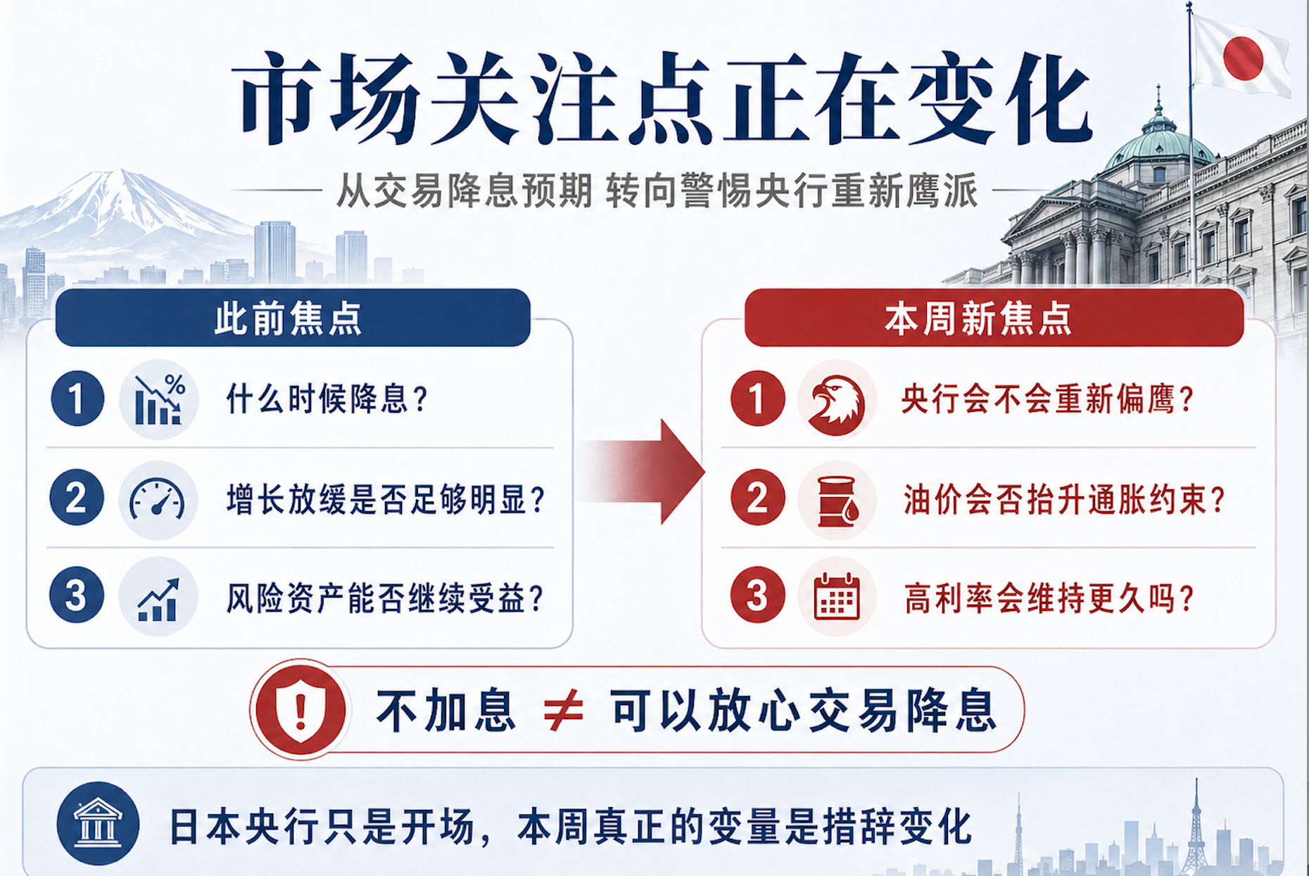 所以,日本央行今天打响的不是“加息第一枪”,而是“分歧第一枪”。它提醒市场,在高油价、高通胀扰动和增长放缓压力同时存在的环境下,全球央行的政策转向可能比此前想象得更慢。本周全球利率交易的关键,已经不只是“谁先降息”,而是主要央行会不会重新强调通胀风险、维持高利率更久,甚至让市场重新定价鹰派可能性。对资产价格而言,这意味着本周的利率决议和央行表态,可能会成为科技股、美元、美债、日元以及港股风险偏好的共同定价窗口。