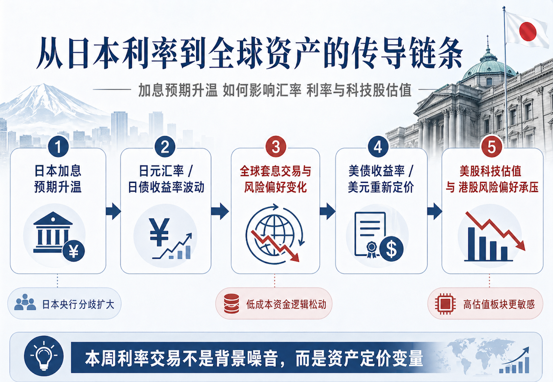 日本利率变化之所以重要,不是因为日本市场本身,而是因为日元长期是全球套息交易的重要低成本资金来源。一旦日本加息预期升温,日元汇率、日债收益率和全球风险偏好都会受到影响。与此同时,美联储本周的措辞会直接影响美债收益率和美元强弱,最后再传导到美股科技股估值与港股外资风险偏好上。对港美股投资者来说,本周利率交易不是背景噪音,而是估值定价的核心变量:高估值科技股需要更低的贴现率支撑,港股也需要美元和外资风险偏好配合。